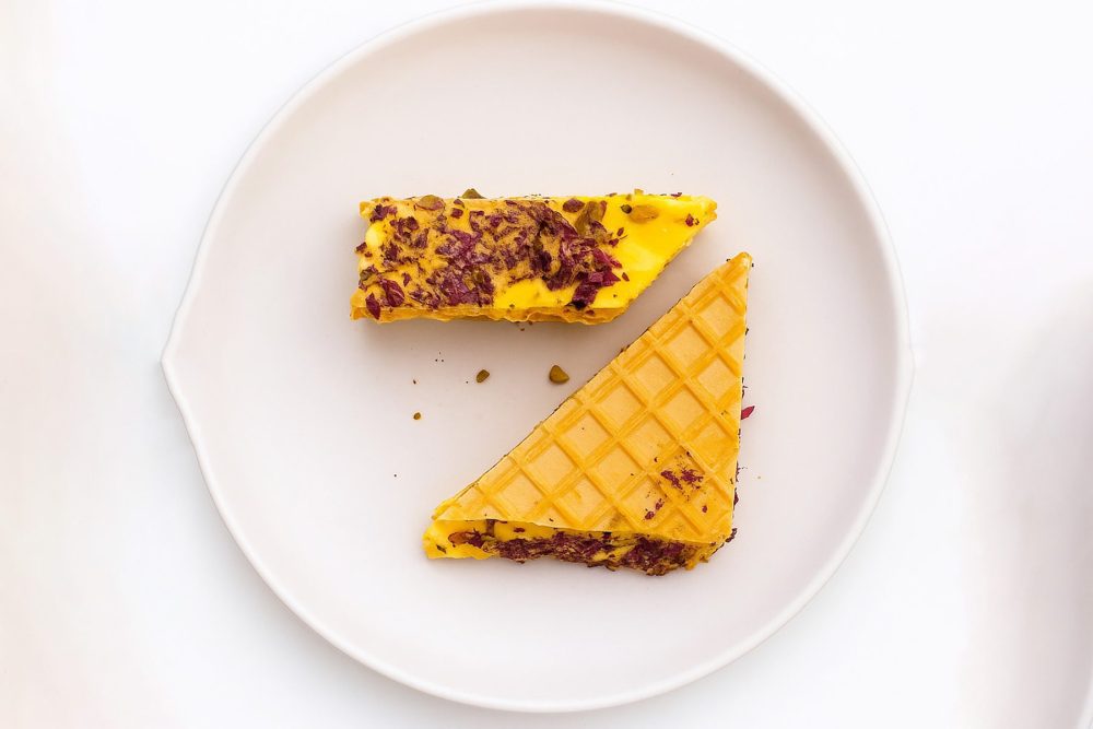 • Gluten in wafer; nut allergy warning due to pistachios